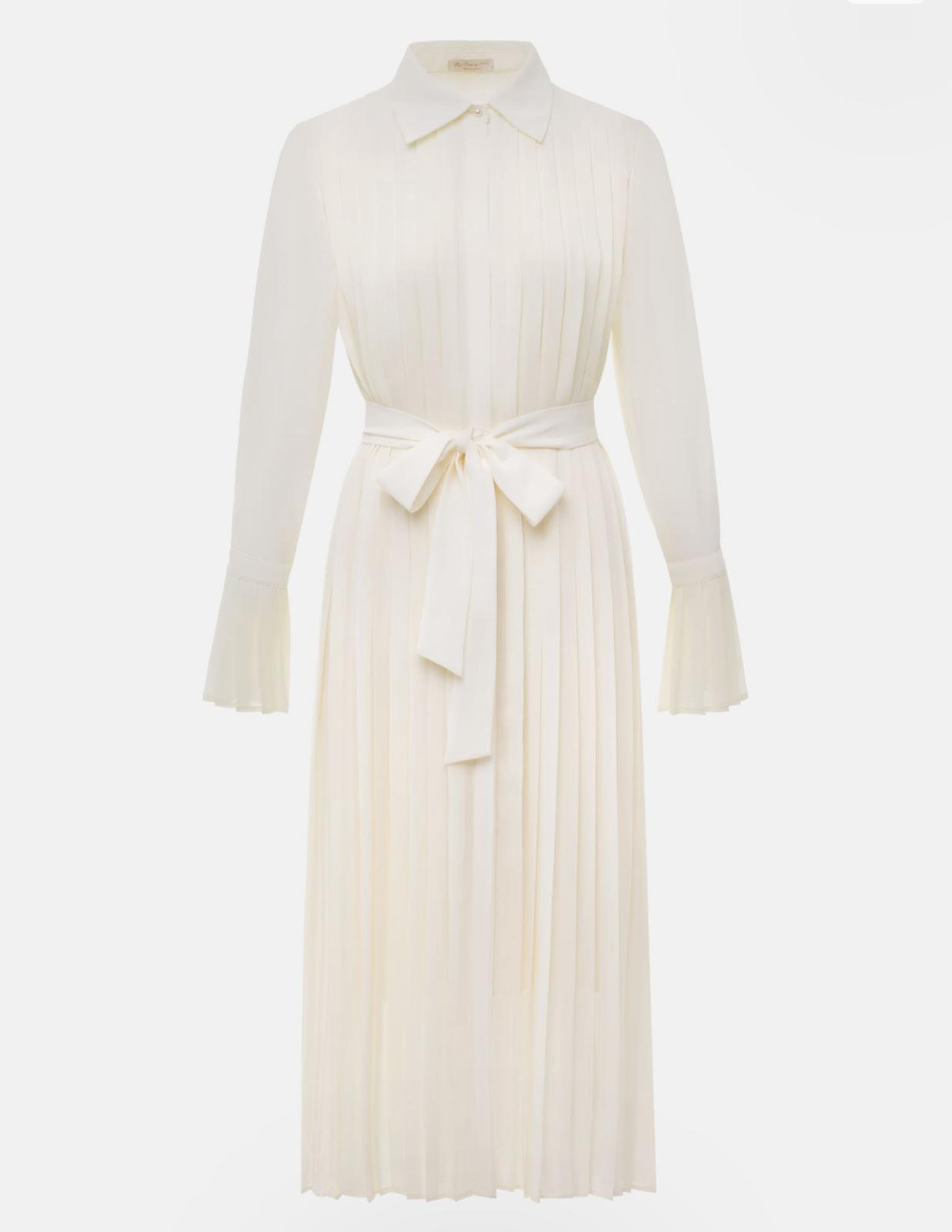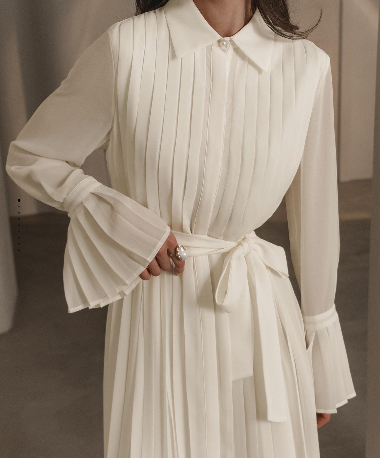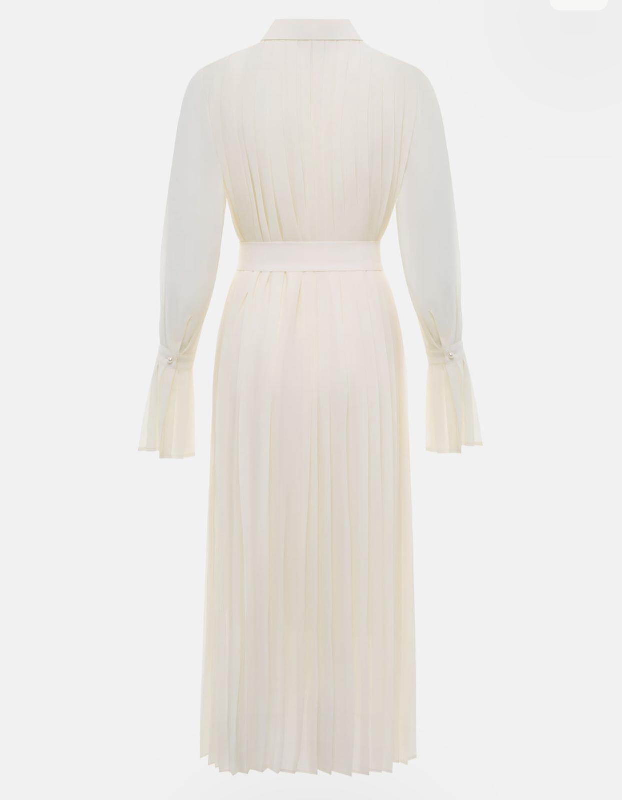 Elegant midi dress of semi-fitted silhouette with a turn-down triangular collar, airy long sleeves with wide cuffs and flared skirt. The dress is made from light chiffon with large vertical pleats and is complemented by a matching ribbon belt.